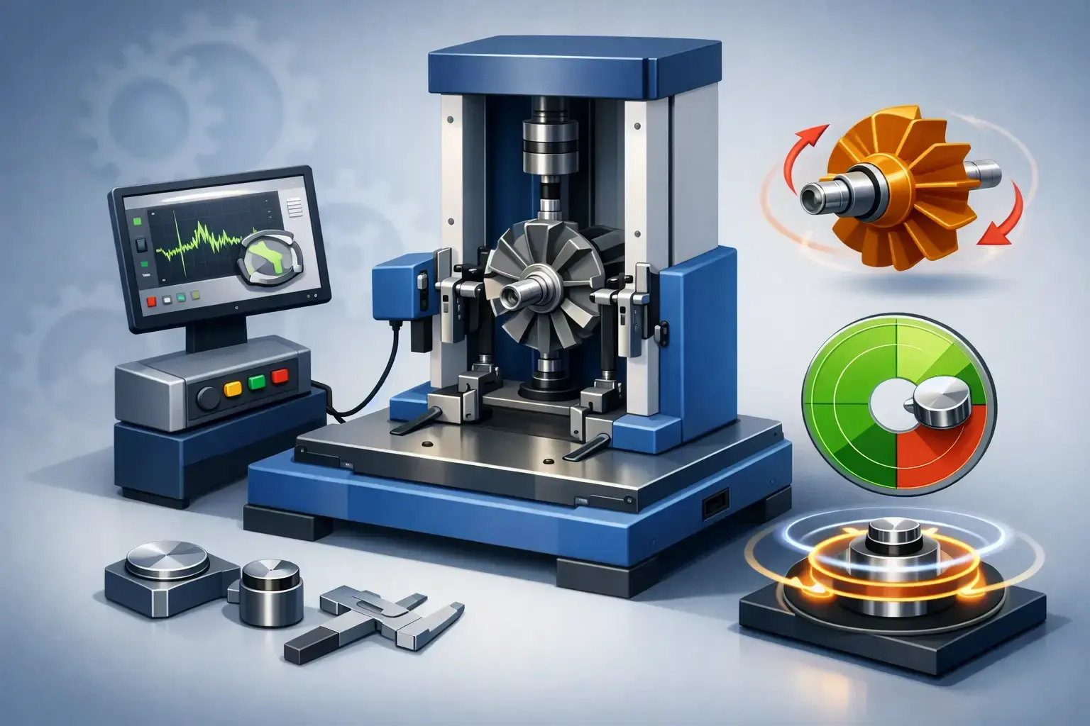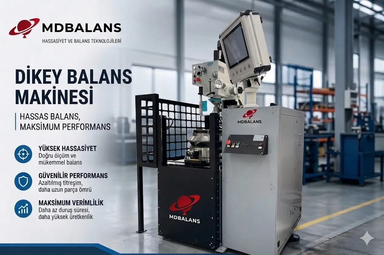 Dikey balans makinesi, rotorun veya dengelenecek parçanın dikey bir mil üzerine bağlandığı ve dengesizlik değerinin bu eksen düzeninde ölçüldüğü balans sistemidir. Bu yapı, özellikle eksenel olarak kısa, çapı görece büyük ve disk karakterli parçaların dengelenmesinde verimli sonuç verir.